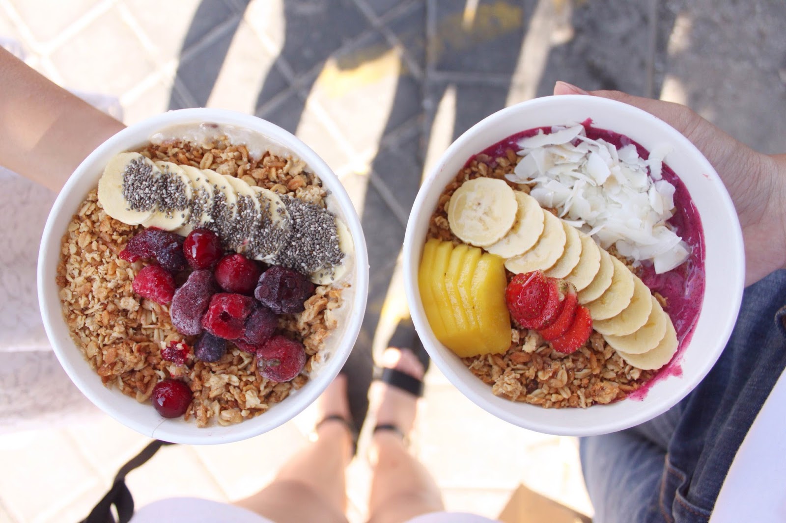 Ik had de Macaronis bowl, met papaya en drakenvrucht. De naam had overigens niets met macaroni te maken – de smoothiebowls zijn allemaal genoemd naar een beroemde Hawaiiaanse golf. De omschrijvingen van de smoothiebowls zagen er veelbelovend uit, dus misschien had ik voor een andere smoothie moeten gaan. In mijn bowl ging sorbetijs, wat fruit, suikerwater, een flinke berg oversuikerde granola en een paar plakjes banaan. Het ijs was onnodig, net als het suikerwater en de suiker in de granola. Zonde, want de basis van een smoothiebowl is al gezond op zich: je blendt wat fruit, eventueel wat groente en suikervrije muesli of granola en klaar.
